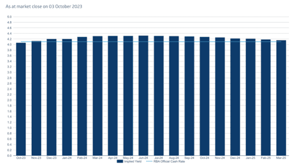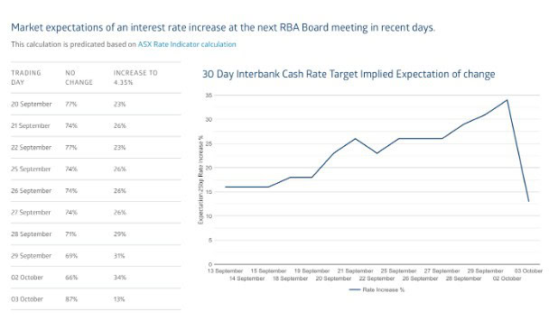The line chart on the right here indicates the expected probability of a rate rise (based upon futures contract betting) in the lead up to the RBA’s announcement on the 3rd of October, where rates were held stable at 4.1%.