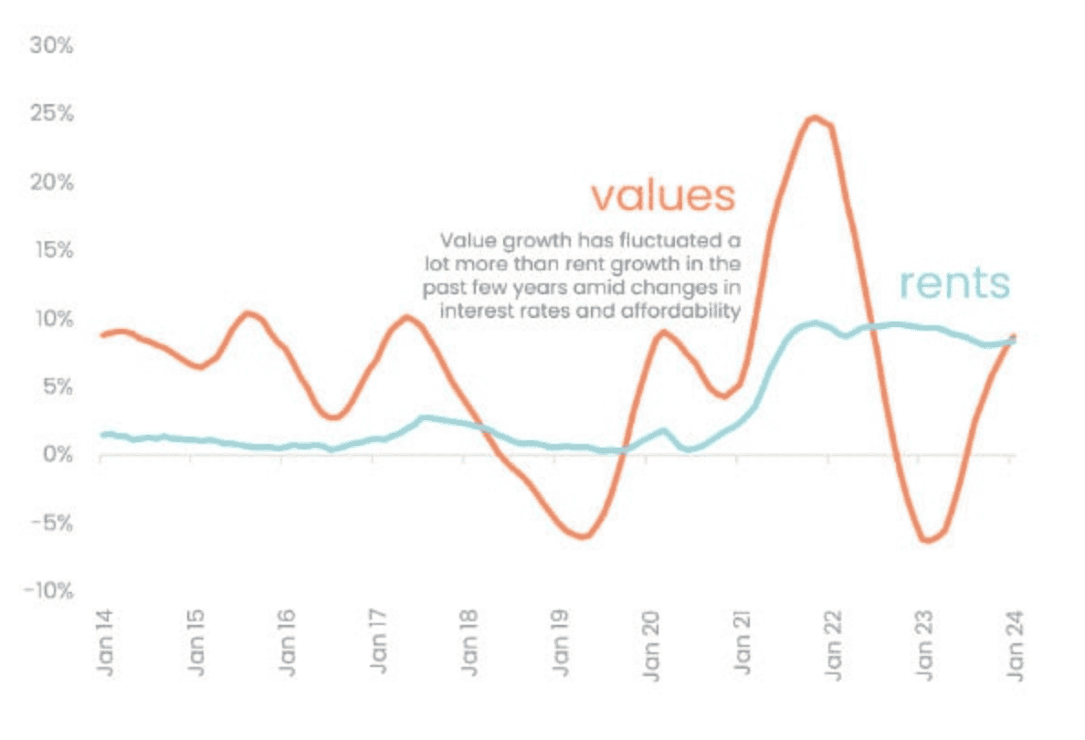 We can observe the effects of this discrepancy within Melbourne’s rental market, compared to the performance of Melbourne house prices: