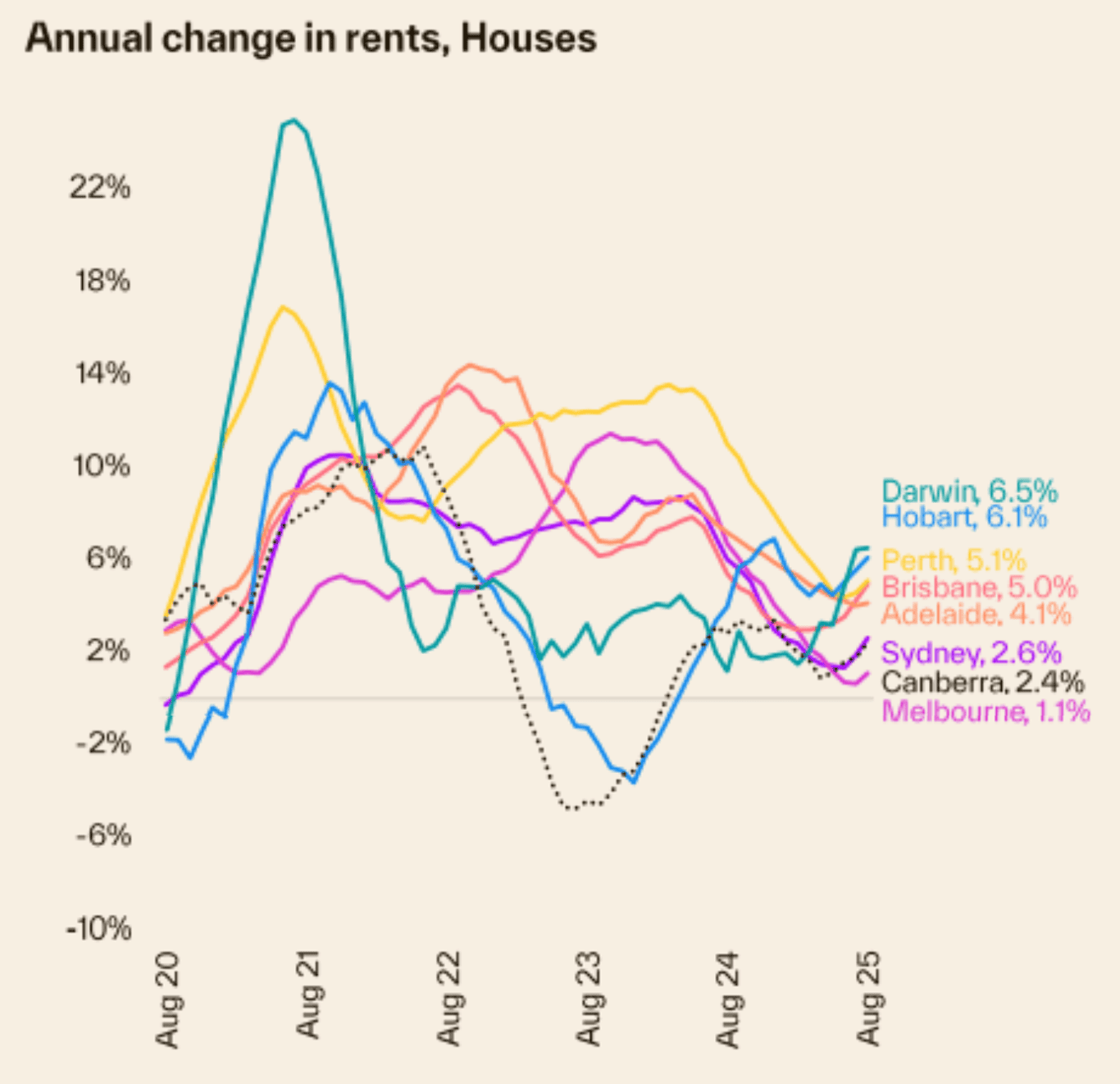 On the rental front, national rents lifted 0.5% in August, the fastest rise since May 2024. Annual rental growth also rose to 4.1%, suggesting a fresh upswing may be underway. Darwin is again the standout performer, with gross rental yields now sitting at 6.5%. At the other end of the scale, Sydney and Melbourne recorded the weakest rental growth, but the trend appears to be picking up.