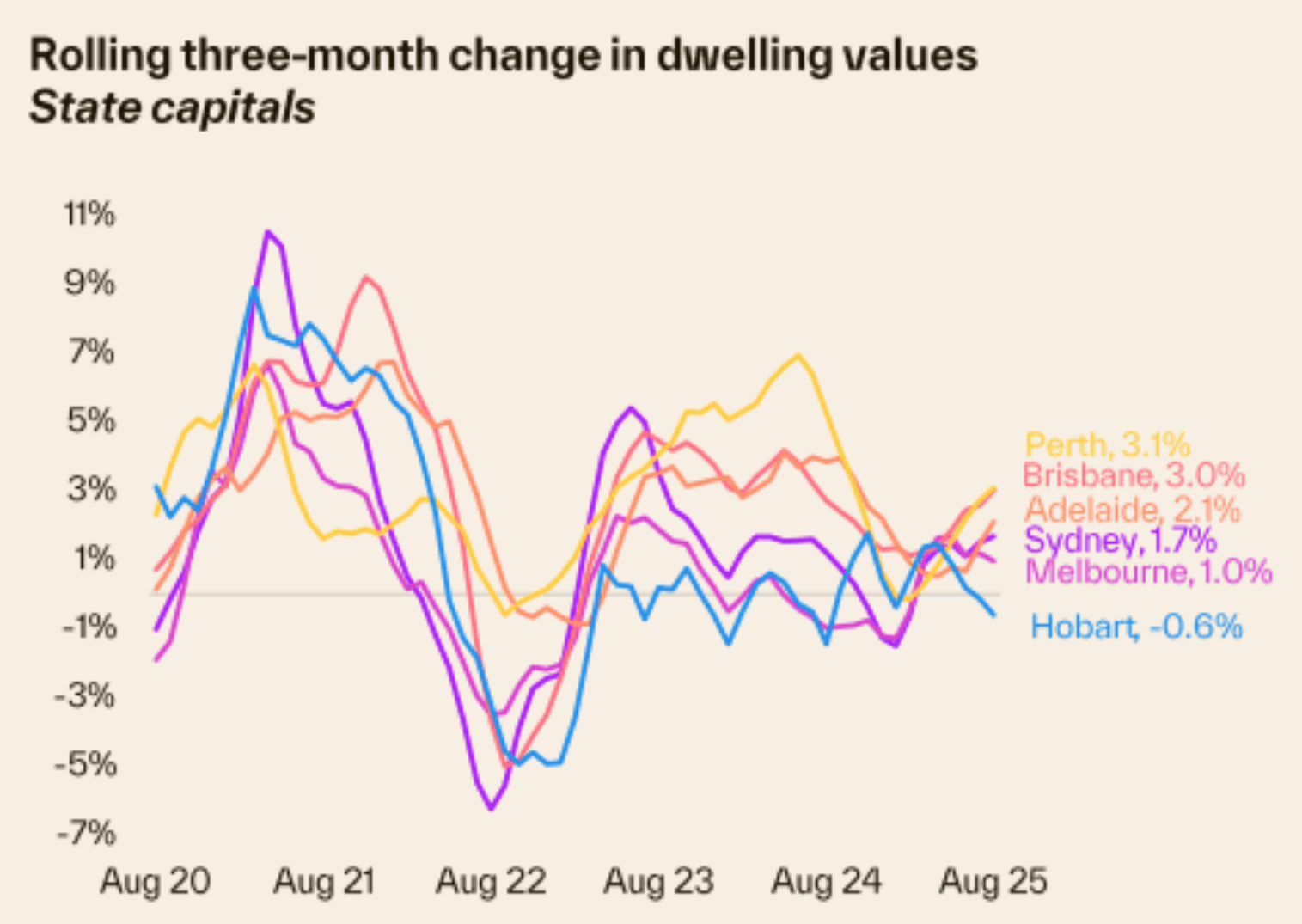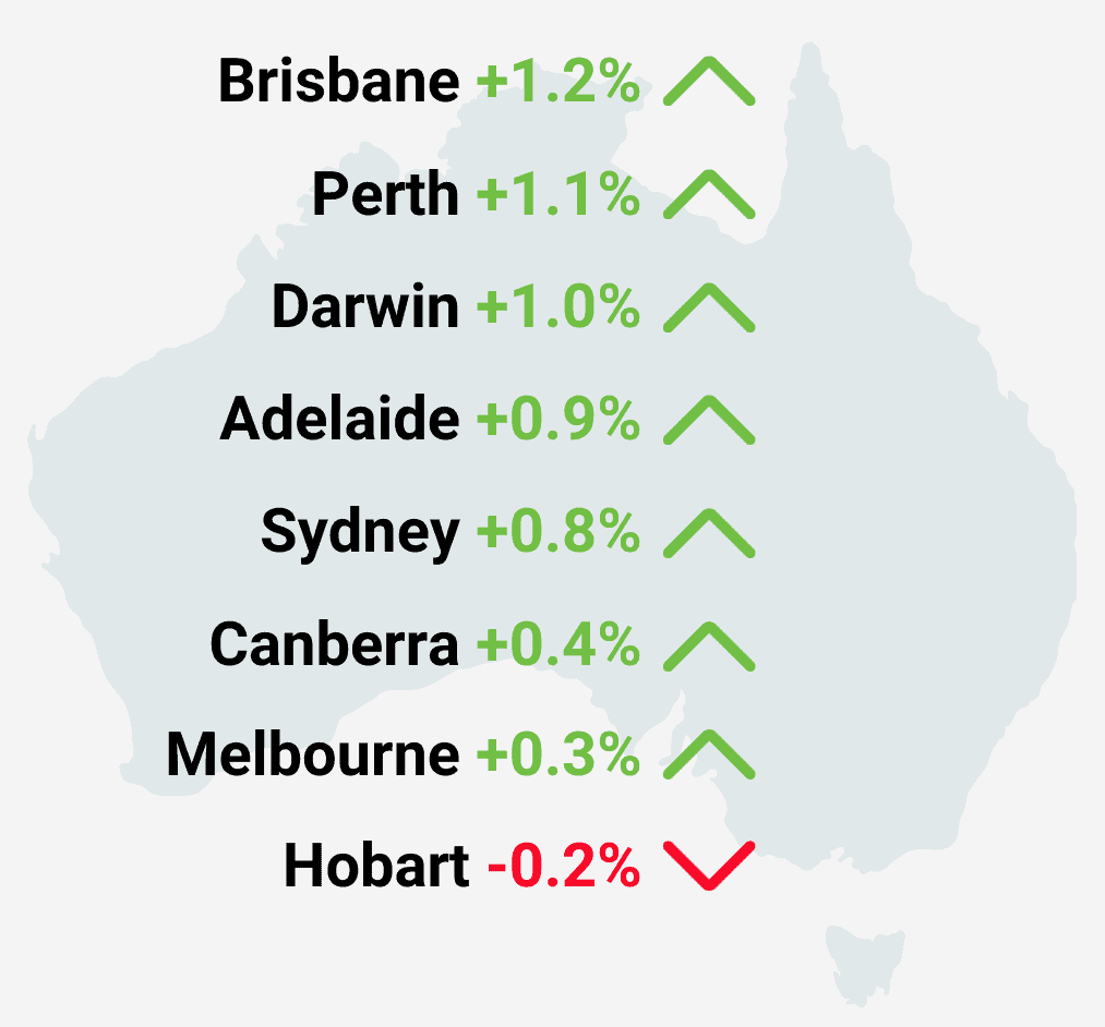 Mid-sized capitals remain the top performers, led by Brisbane (+1.2%), Perth (+1.1%), Adelaide (+0.9%), and Darwin (+1.0%).