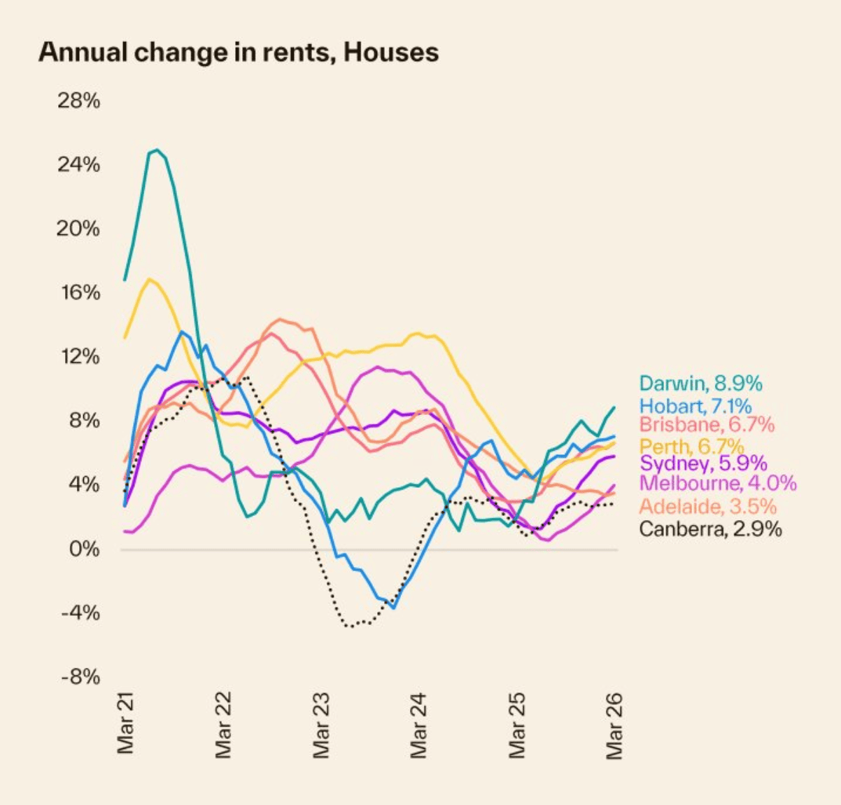 At the top of the ledger, Perth surged 2.5% in March alone and is now up 24.3% over the past year. Brisbane delivered 1.8% for the month and 19.0% annually. Darwin and Adelaide are both running hot, up 19.7% and 11.4% respectively over twelve months. These mid-sized capitals continue to break record highs and are attracting significant attention from professional investors chasing momentum and yield.
