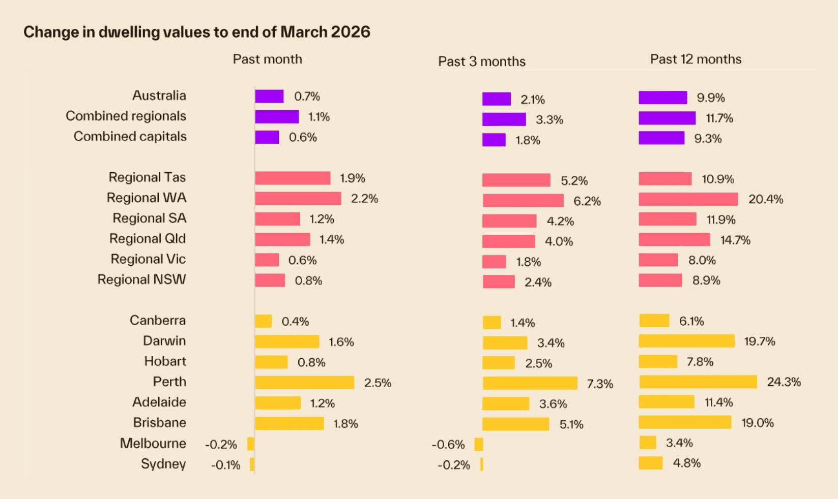 The Cotality Home Value Index for March 2026 confirms what we have been seeing on the ground. Nationally – values rose 0.7% for the month and 9.9% over the past year. But the city-by-city story is where it gets interesting, and the divergence between markets is creating very different conditions for buyers depending on where they are looking.