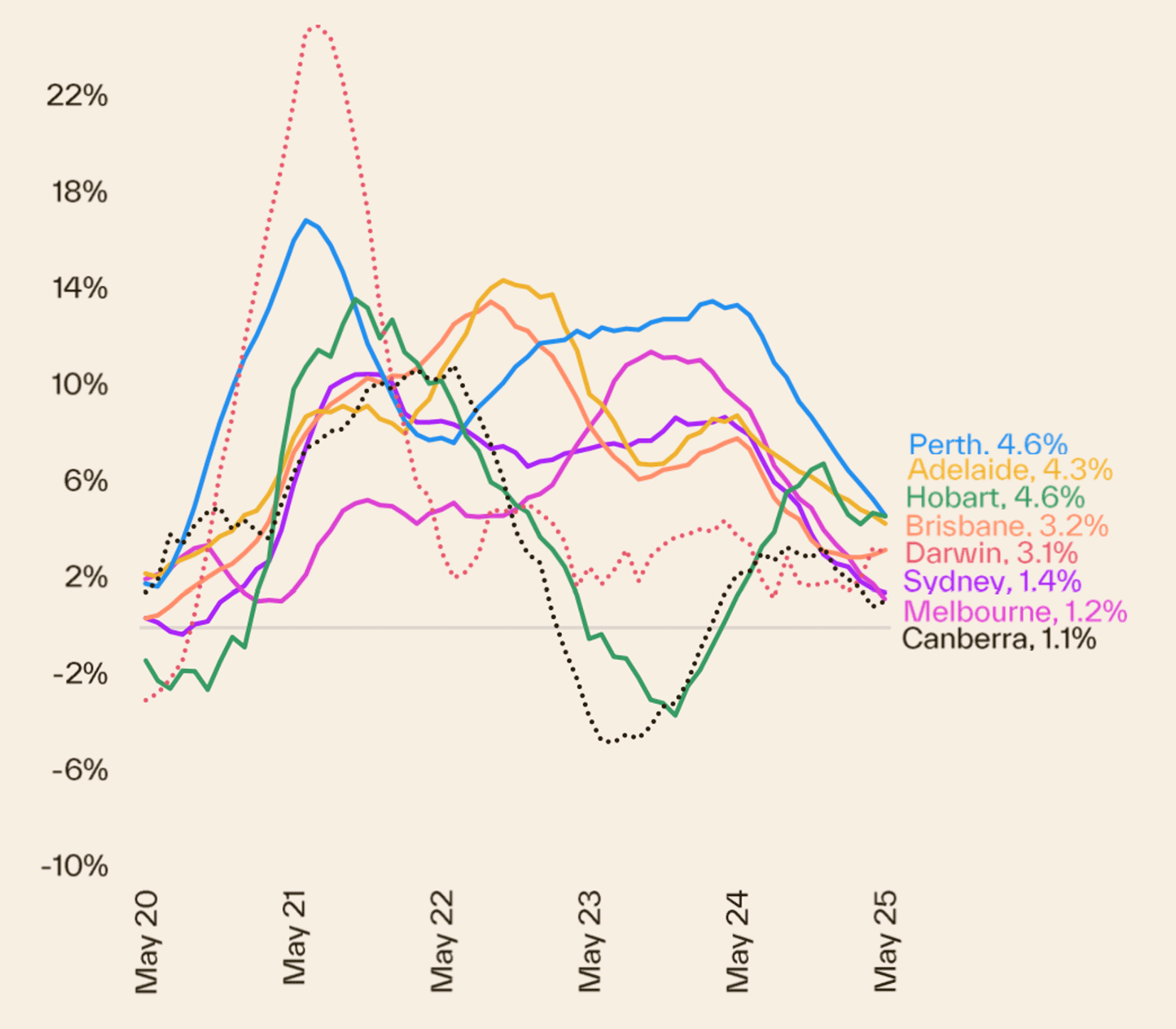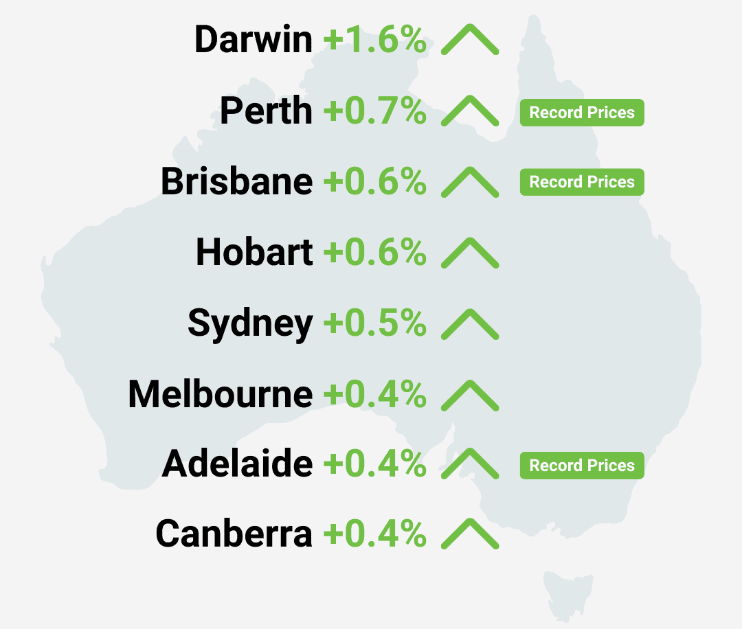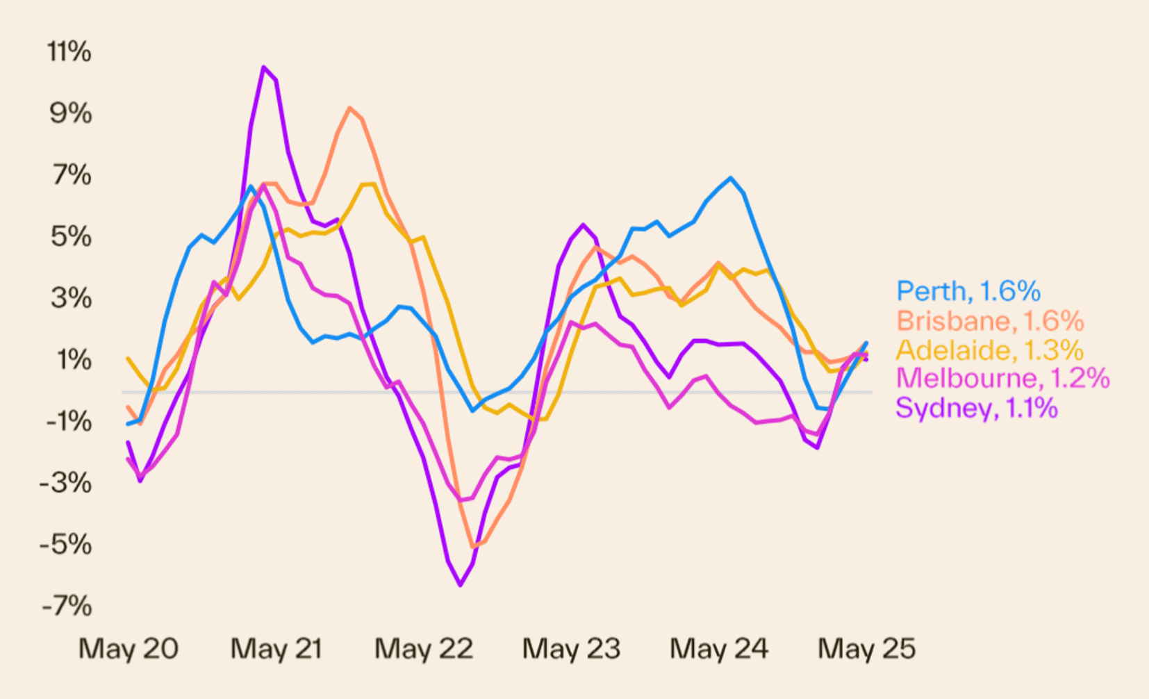 Darwin recorded the largest monthly gain at +1.2%, while Hobart followed closely with +1.0%. Sydney and Melbourne both saw modest increases of 0.3% each. Melbourne remains roughly 5.1% below its late-2022 peak, but its recovery continues to stabilise.