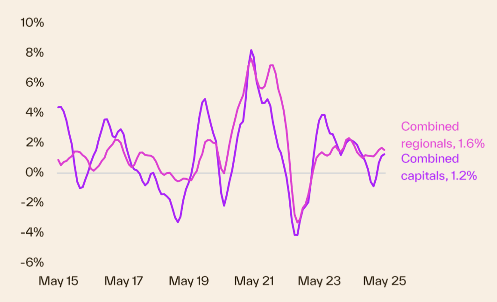 Change in dwelling values to end of May 2025